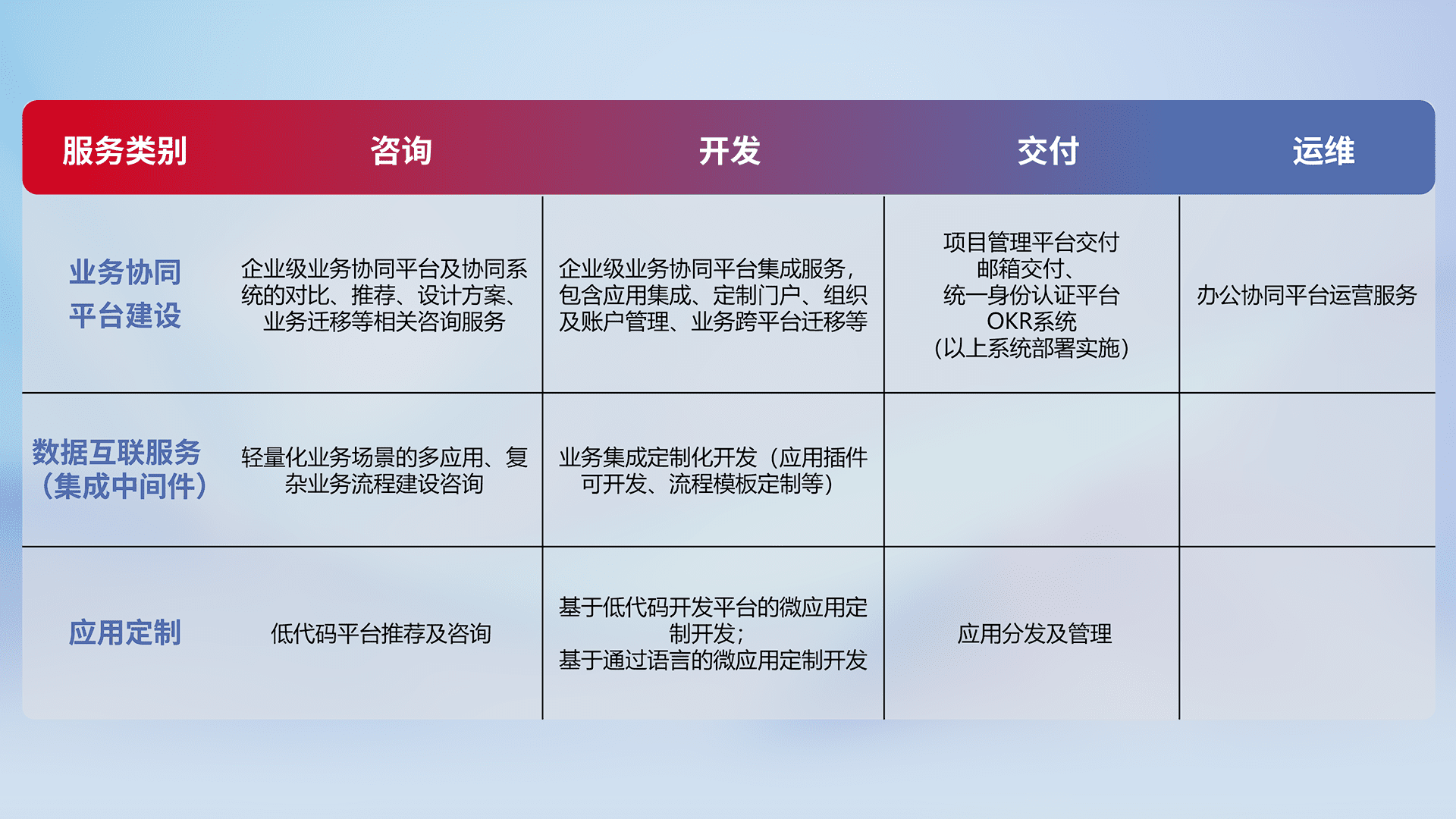 针对钉钉、、、、企微、、、、IDaas等平台级产品提供产品的规划、、、、方案、、、交付、、、定制化开发等服务,,,实现如统一协同办公、、、、智能客户服务、、、混合会议管理、、、智能数据查询、、、等业务场景,,,实现数字化转型。。。